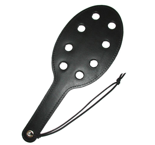 This paddle is 16″ long, including the handle, and 6″ wide at its widest point. Made of smooth, black latigo leather, it has a firm but flexible skeleton, plus eight holes in the business end, making it capable of landing a solid swat.